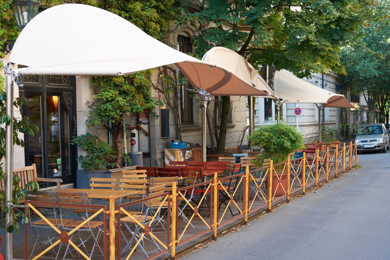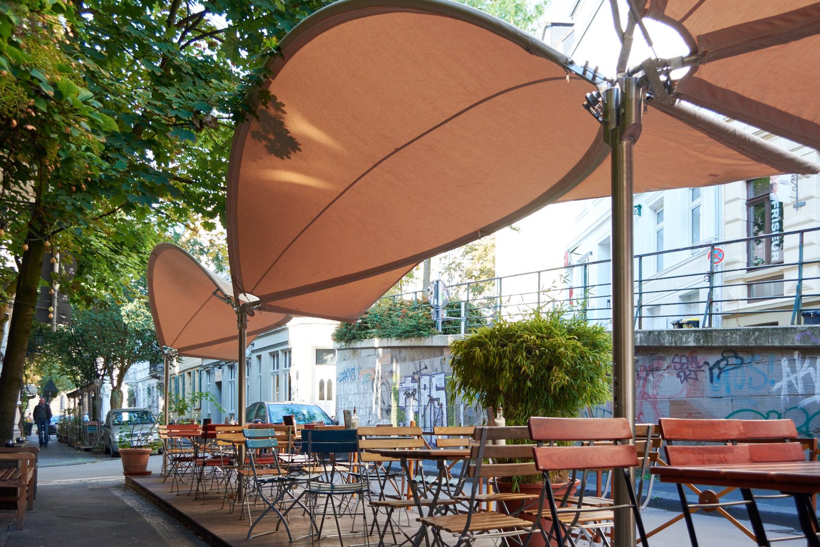 klappbare Markise für den temporären Biergarten der Gaststätte Katzengold